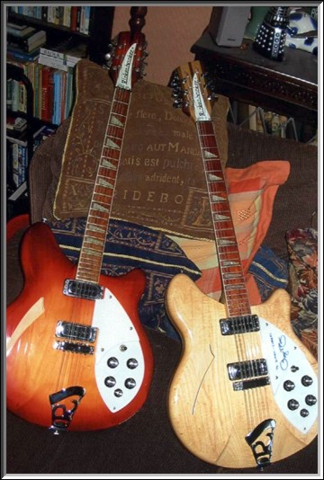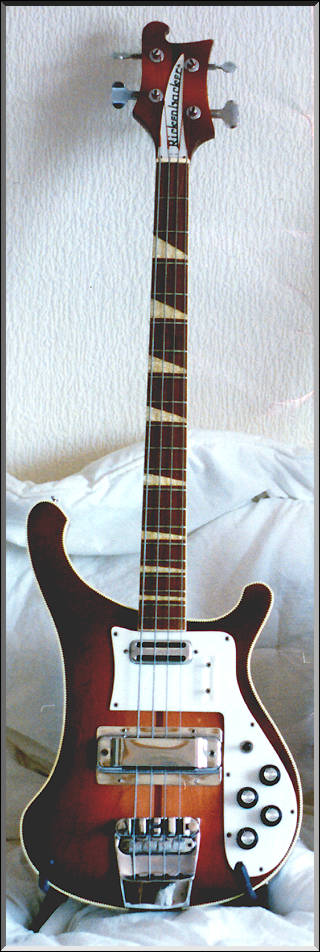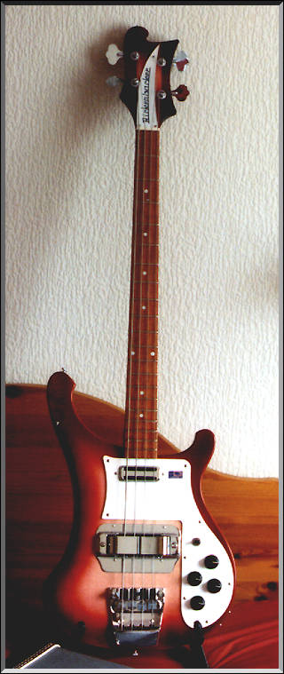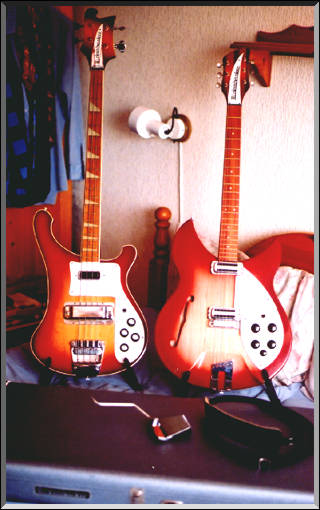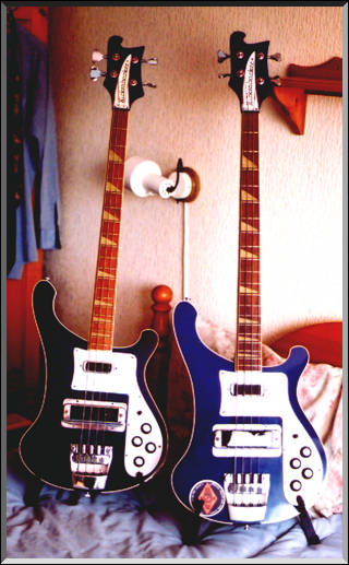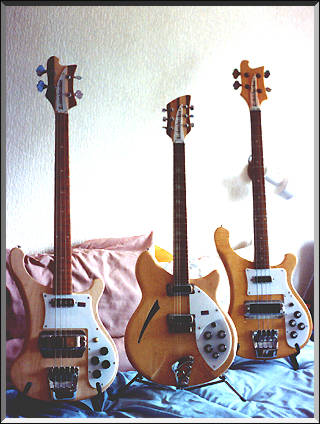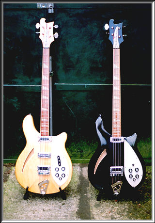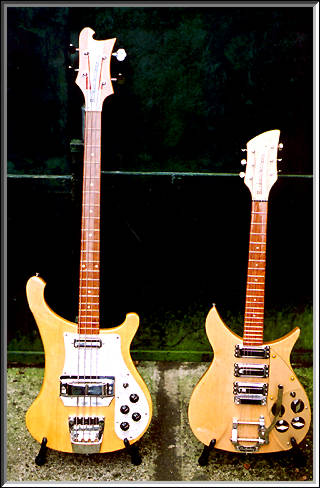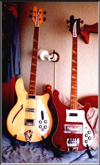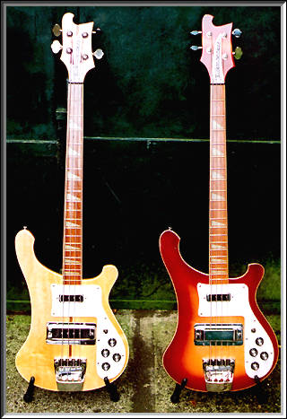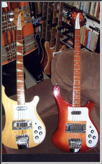 A Burgundyglo 4001(L) from Jan '78, and a beautiful 4005 Mapleglo (R) from Nov '74 - the previous owner in America fitted an additional "toaster" pickup - all three pickups now have simple, individual on/off switches.....the most fun-to-play bass ever!!