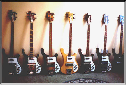 Left to right: 4003S/8, 4005, 4004 Cheyenne, and two "specials": A cream yellow 4003S (with Chris Squire style updates) and a 4001V63, now in Fender Sonic Blue (with perloid scratchplate)!